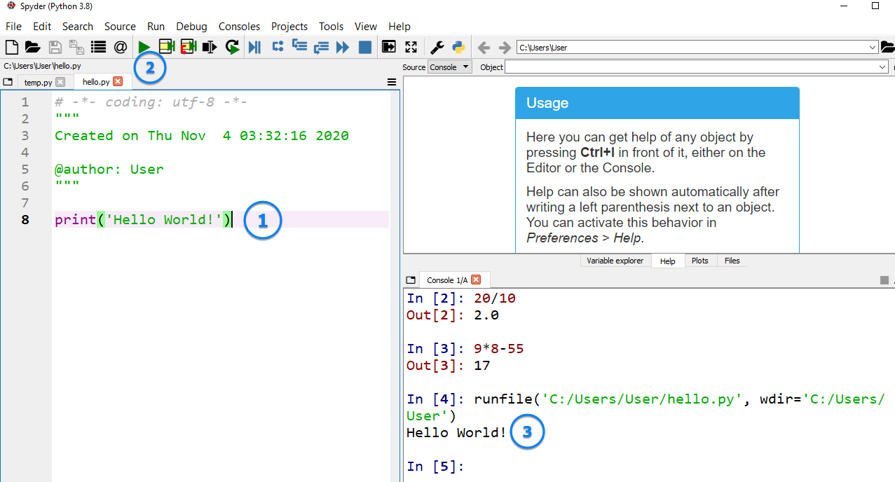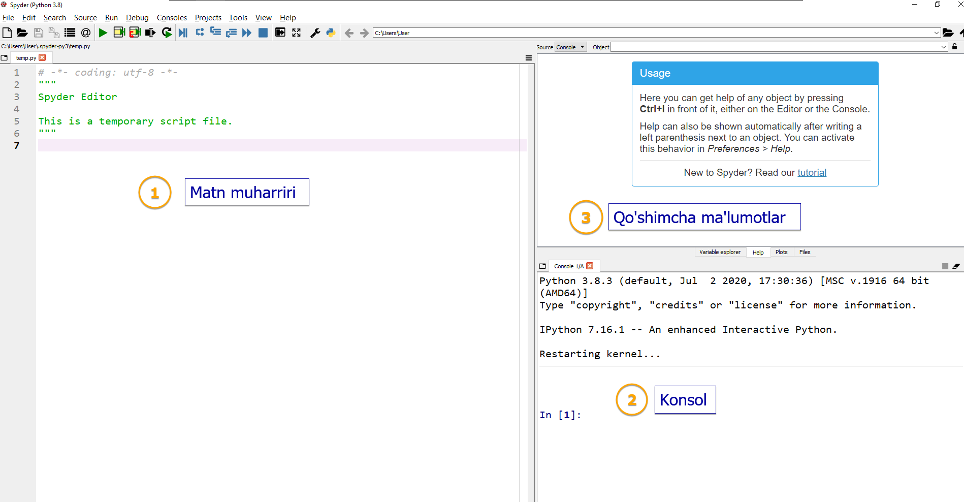Spyder konsolida va matn muharririda quyidagi kodlarni yozib, bajarib ko'ring. Siz kutgan natijalar chiqdimi?