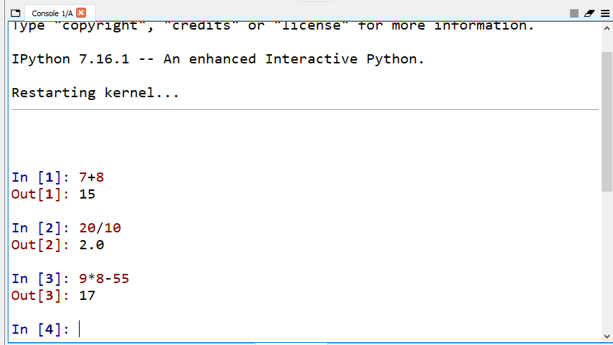 Konsolda qisqa kodlarni bajarib, natijasini ko'rish mumkin. Misol uchun oddiy arifmetik amallarni bajarib ko'raylik: