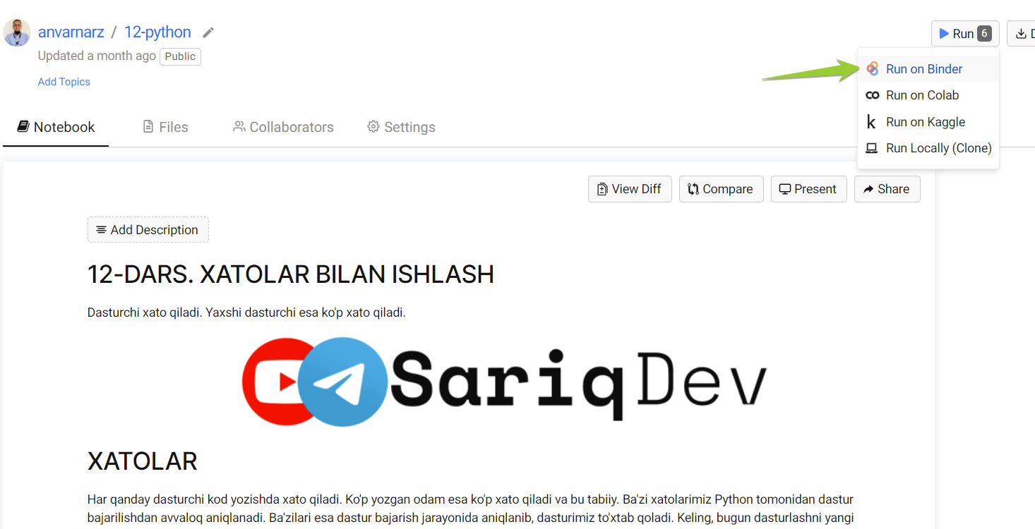 O'zignizni qiziqtirgan mavzuni bossangiz, dars yangi oynada ochiladi. Endi interaktib noutbukni ishga tushirish uchun sahifa yuqorisidagi Run va Run on Binder tugmasini bosing.