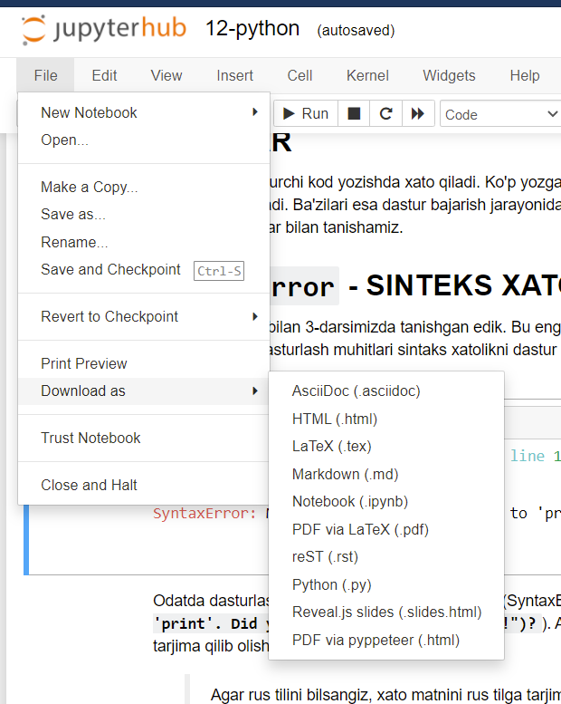 Yana bir qulaylik, istalgan darsni PDF yoki python (py) va boshqa formatlarda kompyuterga yuklab olishinigiz mumkin. Buning uchun yuqorida File-Download as menusiga kirsangiz kifoya.